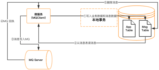 有时候我们目前的MQ组件并不支持事务消息,或者我们想尽量少的侵入业务方。这时我们需要另外一种方案“基于DB本地消息表“,流程图如下: