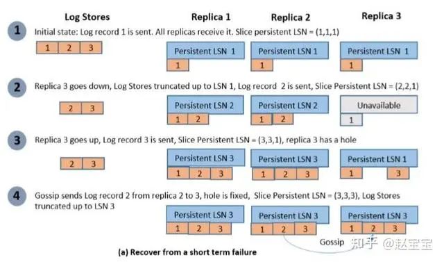 Slice的replication采用N=3,W=1, R=3的leaderless replication策略,只要SAL等到了其中1个slice副本的响应,那么对应的write buffer即可释放并重用。某个slice副本收到的最大的LSN叫做flush LSN。由于slice副本可能会缺少某些buffer形成空洞,所以每个buffer都有slice ID和序列号标识,Page Store可以根据这序列号来发现遗漏的buffer,也即是判断是否有空洞。某个slice副本持久化的、最大的、没有空洞的LSN叫做persistent LSN。Slice的副本之间会通过gossip协议补齐自身的空洞。