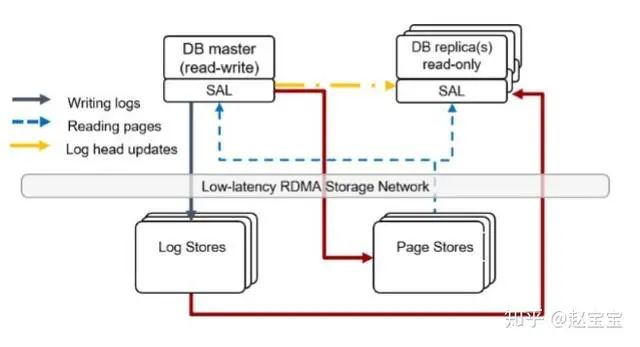 Taurus也是采用“log is database”的理念,存储层分为Log Store、Page Store两个模块,前者负责持久化log,后者负责page的读取。log持久化、page读取都只需要一跳网络传输。