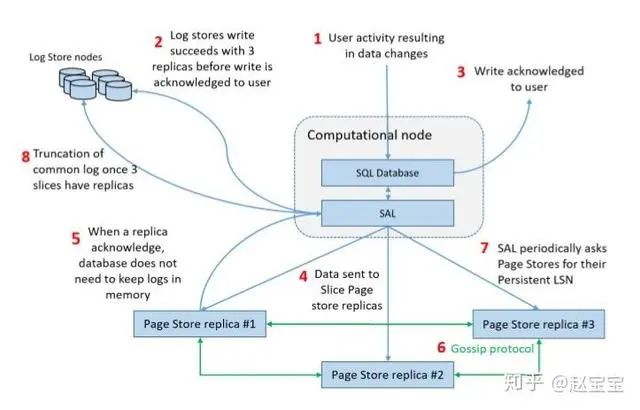 Socrates也是采用“log is database”的理念,但是它单独了一个log层用于快速持久化log(具体实现不详),避免受到重放log、回写page的影响。另外,page svr层从log层拉取log进行重放、回写page,并向计算节点提供读取page的服务。但是page svr层只将部分page缓存在本地,全量的page在额外的冷备层。所以Socrates的读请求有可能在page svr层本地无法命中,进而从冷备层获取page。