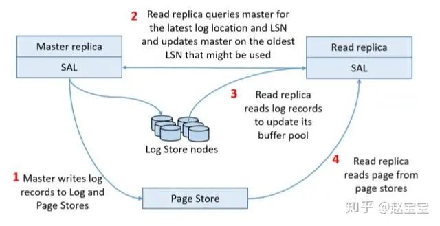 Log Store负责持久化log,一旦事务的所有log持久化之后,那么SQL前端即可通知client事务已经提交完成。另外,Log Store负责为RO实例提供log内容,后者需要重放log来更新自己buffer pool中的page。Master实例周期性地告知RO实例最新log的位置,以便RO实例可以读取到最新的log。