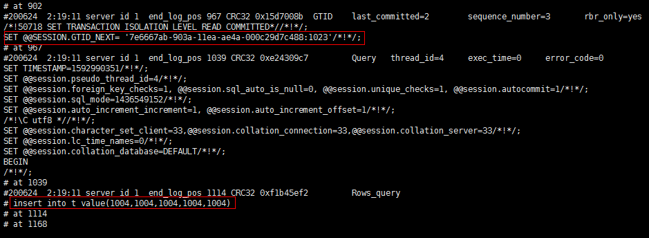 从主库解析的binlog中可以看出出错事务的GTID是:7e6667ab-903a-11ea-ae4a-000c29d7c488:1023。