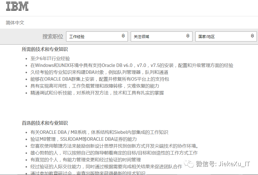 下边是 IBM 的 DBA 招聘要求,看看符合要求不?但是这要求 Oracle DB v6.0,v7.0,v7.5 的安装,这信息得是多少年没有修改了啊,看看就好吧,继续了。