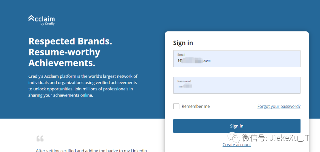 acclaim 会在你考试完后申请证书过后发邮件让你领取徽章,可以去自己的邮箱找找看,个人取得所有的国际认证,都在 acclaim上 可验证查询。也可以在个人 LinkedIn、Facebook、Twitter 上嵌入。