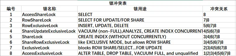 锁是实现数据库并发控制必不可少的功能,PostgreSQL数据库通过其特有的多版本属性实现了MVCC,实现了读不阻塞写,写不阻塞读。PostgreSQL中表锁有八个级别,不同的锁对应了不同的排他级别。值得注意的是同一时刻两个事务不能再同一个表上获取相互冲突的锁,但是一个事务是永远不会与自己冲突的,一个事务里连续获取两个有冲突的锁类型是没有问题的。