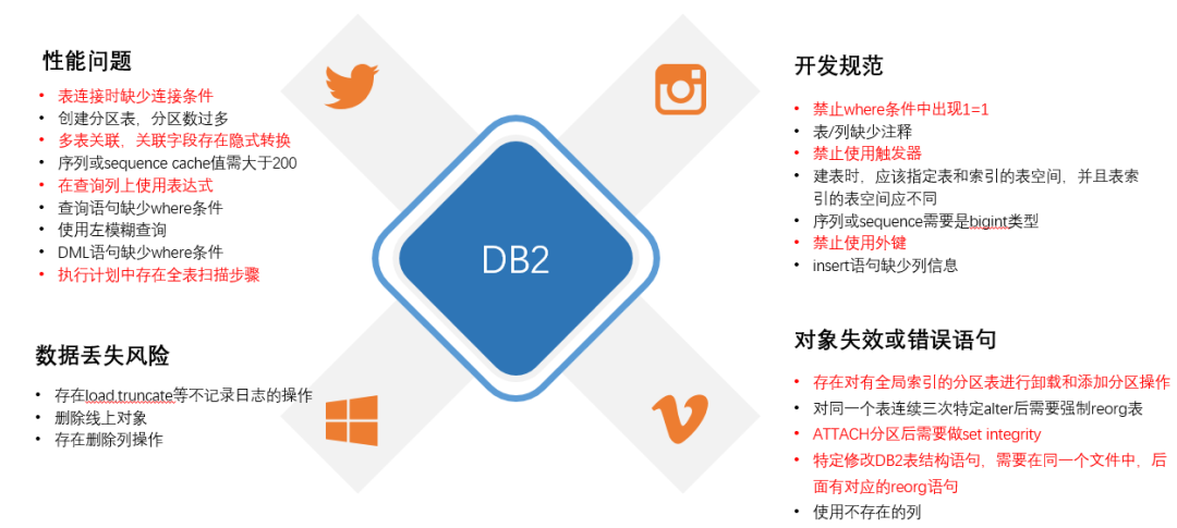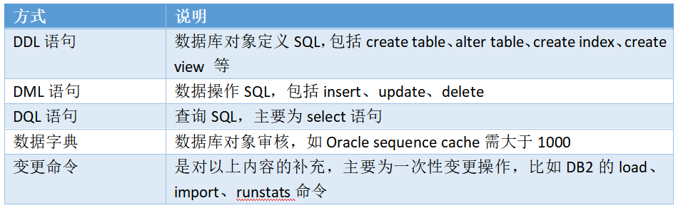 规则分类:我行审核规则支持DB2、Oracle、MySQL三种数据库类型,按照审核关注点的不同,可分为性能问题、开发规范、数据丢失风险、对象失效或错误语句几方面。