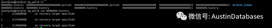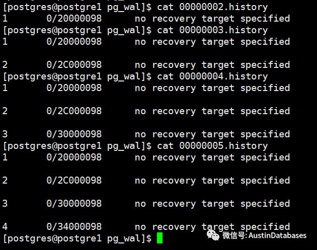 当从级提升到新主级时,它会创建一个新的时间轴,以避免WAL名称重叠。history文件包含关于数据库时间轴分支的信息。恢复过程使用这些信息来确定它正在处理的时间轴。
