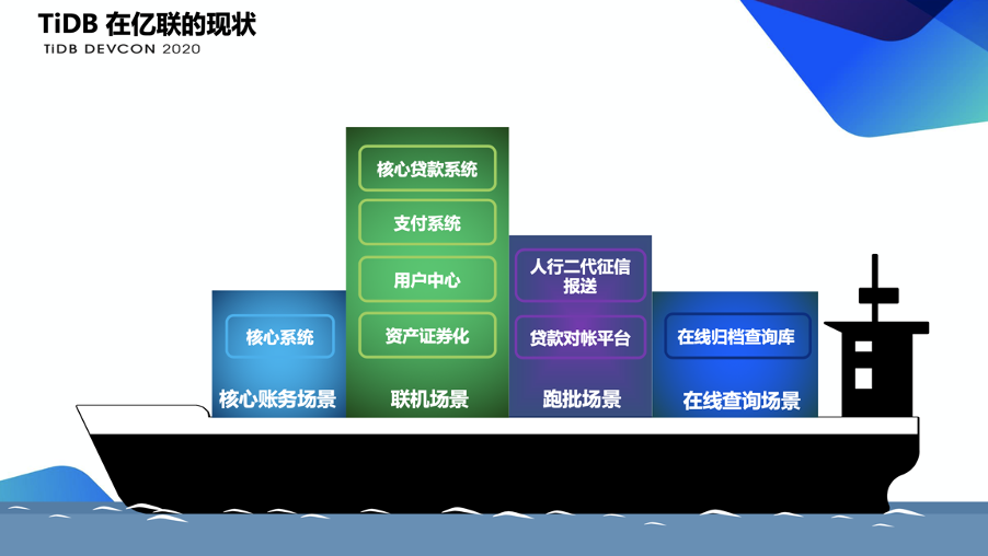 本文主要想将亿联银行核心系统使用 TiDB 过程中遇到的一些问题和处理的方法分享给大家,希望对大家以后的工作提供一些借鉴和帮助。下文内容将分为四个部分:第一个部分是亿联银行数据库的建设方法和建设的历程;第二个部分是 TiDB 数据库在亿联银行生产环境落地的应用情况;第三是亿联银行核心系统 TiDB 建设的一些历程;第四是我们做这件事情的价值和意义。“一上”是将我们数据库的一些处理工作上升到应用层面去解决,在数据库层面禁用存储过程、触发器、视图等功能,让我们数据库变得轻量化和简单化。这样做有两个好处:第一是减少我们数据库的压力,让数据库变得更好地满足业务的需求;第二点是让数据库应用层跟数据库层技术进行解耦,让上层的应用不依赖于底层的技术。我认为去 IOE 真正意义是在于通过解耦来减少技术的依赖。“一下”是我们将数据库的一些分库分表的功能给下放到底层分布式数据库层面来解决,减少一些研发的成本和工作量,让我们研发人员更专注于代码功能的实现,加快项目的上线效率。我们在成立之初就使用了 MariaDB 的数据库技术,我们当时也是考虑数据库的一些开放性和开源性。作为一家银行,我们的数据安全也是用户的资金安全,所以我们采用了 MariaDB Galera 的强同步机制,并且我们同步制定了严格的技术标准和配置规范,对一些存储过程统一使用 MySQL 协议,还限制一些事务大小,还有我们通过限制组件的使用等等进行数据库标准化的工作。但是随着业务发展,对数据库带来了性能和容量的挑战,这时候我们需要采用分库分表技术来解决性能的问题,但是分库分表的架构又带来了新的问题,因为他的代码改造工作量,还有全局一致性的问题需要消耗我们的开发成本去解决。在扩容这部分也是非常复杂的,因为分库分表的数据库的扩容是一个庞大的工作量。还有我们运维的复杂度,对一些 DDL 的操作是需要有一些变更的工作在后半夜进行。我们在 2018 年的时候就开始考虑采用分布式数据库技术来解决以上的问题,我们进行了大量的 POC 工作,当时测试了市面上大部分的 NewSQL 产品,之后我们选定了 TiDB 架构,为什么?主要有以下考虑:首先,TiDB 是支持 MySQL 协议的,对我们应用适配改造的成本较小。第二,TiDB 本身是存储引擎分布式的,对我们研发的分库分表的工作量有所减少。第三,它的扩容非常方便,它可以通过增加服务器达到线性的能力提升。第四,也是最重要的是支持在线 DDL 的操作,这会减少我们研发和运维人员的工作量,我们计划通过在后续采用数据库的 SQL 审核平台,以及自动化执行平台对接 DevOps,来实现数据库的自动变更操作。最后,就是它强大的高可用架构,TiDB 本身是采用 Raft 多数派协议,根据不同的部署位置可以实现同城的多活或者异地的灾备,还可以支持同 MySQL 其实数据库进行一些复制,所以说 TiDB 的高可用架构还是很强大和灵活的。但是技术真的没有银弹,我们在使用 TiDB 过程中又碰到了一些问题。我归纳为两类问题。第一个问题是 TiDB 本身的一些问题:锁机制;事务隔离级别跟我们现有应用的兼容性;它的一些数据热点问题带来的一些性能问题;还有资源隔离性问题造成大量的服务器浪费。因为 TiDB 本身是硬件起步比较高的,每个集群在我们生产环境部署的服务器数量至少六到九台,并且它的隔离性造成了我们的应用只能在一个集群部署一套。还有一类问题更严重,就是应用适配问题。因为我们银行大部分的应用都是采用传统的关系型数据库来做的机制,他采用了很多超长的事务和串行的处理机制,不适合数据库的架构。还有一点是我们研发人员和应用设计人员对分布式数据库的原理不是很了解,在代码实现过程中没有考虑分布式数据库的一些特性,没有把分布式的优势发挥出来。首先在应用适配问题这块,我们制定一个针对分布式数据库的规范。比如在应用架构设计的时候尽量采用一些并行的机制来执行,还有我们数据架构设计的时候可能禁用一些类似自增主键这些功能。在 4.0 这个版本 中 TiDB 本身的问题已经得到了很好的解决,比如它支持了悲观锁,还有他的事务隔离级别是支持 RC 了,还有一些数据热点问题的可视化,通过容器化部署还可以解决资源隔离性的问题,让我们通过容器的隔离性来解决数据库多实例的征用,我相信 TiDB 4.0 将是一个成熟的版本,期待它在亿联银行有广泛的应用,也更期待它后续给我们带来的挑战。下图是我们亿联银行分布式数据库在生产环境落地的情况。我们在 2018 年年初的时候遇到了在线支付查询场景的性能问题。当时我们通过建一套 TiDB 的归档库,将一些查询类的交易迁移到 TiDB 的归档库进行解决。在 2018 年年中的时候我们又遇到了一个批量的问题,因为我们是互联网业务,很多业务特性是高频、量多、金额少,所以每天批量场景的数据量是很庞大的,在 2018 年年中的时候我们每天的日批将近四千万条,这就造成了我们批量的时间过长,已经达到了 12 个小时,影响了我们监管上报的时效性。所以我们通过 TiDB 进行了数据的迁移,将这些场景通过 TiDB 的一些高并发特性进行了解决。在 2019 年的 10 月份我们上线了第一个关键的联机场景,就是核心贷款系统。核心贷款系统也是亿联银行一个重要的业务,主要对接一些三方的平台进行个人贷款的场景,所以它的并发量