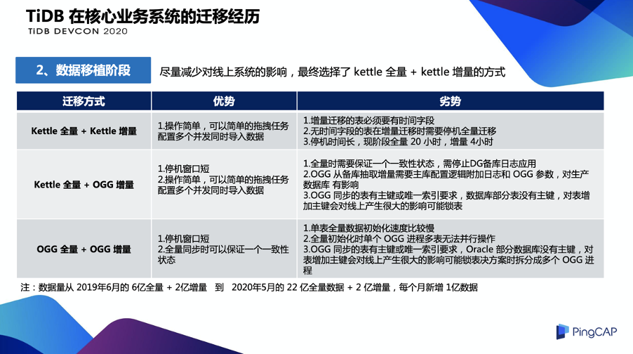 在这介绍一下什么是热点账户场景吧,因为后面有很多问题也是热点账户问题造成的。热点账户场景在我们业务层面来说是多个大量的动账操作同一个账户余额,并且这个账户余额要实时更新,不允许透支,在数据库层面怎么理解呢?就是,大量的操作同一行数据,并且我们 Select 操作还是会加 for update 这种独占模式的,这势必会造成大量行级的争抢,但是 TiDB 乐观锁是通过版本号来控制提交的,我们在这种场景下可能会有大量无效的提交和大量的回写,所以不适合我们这种高并发的 ACID 场景。第二阶段是数据移植阶段。数据移植阶段当时我们出具了三种方式:第一种方式是全量加 Kettle 增量,这种方式的缺点就是它需要在增量的时候有 4 小时的停机窗口,但是它有一个好处就是对应用是没有侵入的。第二种方式和第三种方式我们都采用了 OGG 的方式,OGG 在我们这有一个大的问题,就是它必须在生产库有一些应用的改造,比如它需要每个表都有唯一索引或主键。经过评估,出于对核心场景的稳定性考虑,我们放弃了后两种方式。最后是采用了用 Kettle 的方式来进行迁移,但这种方式的迁移当时评估的是两亿的增量数据,需要停机 4 个小时。3. 性能评估阶段