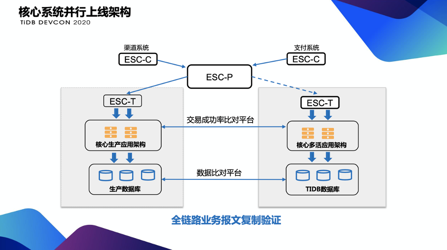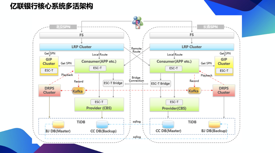 接下来介绍一下我们核心并行上线架构。因为亿联现在的核心在生产环境,新老核心都是在运行的。我们通过在生产环境搭建了一套全新的核心的应用架构,并且使用 TiDB 数据库,我们通过网格计算 ESC-P 这个组件将我们其他渠道类系统还有支付系统发给核心的请求同步一份到新的核心架构,从应用到数据库全链路的进行了生产报文的全面验证,并且我们每天会对当天的交易进行日报的汇总,会分析每笔交易失败的原因是在我们应用层还是在数据库层。亿联的多活系统是部署在两个机房,北京数据中心和长春数据中心,并且进行了账户层面的跨片拆分:东北三省的用户都是将账户开在长春数据中心;其他省份的用户将账户开在北京数据中心。它本身的架构是在同一个城市的多个数据中心多活,因为我们引用一些多数派协议 Raft 或者 Redis 集群,还有 Zookeeper,这种同城多活现在难度并不高。第三个是我们的一个应用补偿机制,因为我们知道在北京的核心生产库,在长春有一个备库,长春的生产库在北京也有一个备库。当时我们考虑到要是遇到一些区域性的灾难的话,这些用户可以切换到对方的数据中心进行运行,但是数据库的复制是有一些延迟的,因为北京和长春跨度是一千公里左右,我们的数据会有一些 RPO 的丢失,我们通过应用录放平台进行一些报文的回放,这样我们的 RPO 理论上是零丢失的。还有我们整个架构是跟厂商进行自主开发的,我们对整个架构的版权还有技术都是自主掌控的。我们的技术架构全部用的是开源技术,在高可用考虑上面都是从 PaaS 和 SaaS 层面去解决的,所以在 IaaS 层面的一些稳定性考虑不用太多。上图是我们核心的详细架构。北京数据中心和长春数据中心在上层是通过 F5 来进行区域用户分配的,我们可以按照省级运营商用户颗粒度进行数据中心位置的指派。我们将长春的用户指到长春数据中心,将北京的用户指到北京的数据中心,就是通过 F5 这个 GTM 功能来实现的。下面是一个 LRP 的数据路由平台,它会将用户分发到它对应的生产库里去。因为北京的用户可能去上长春去出差,有这种场景,他从长春访问来之后,发现他的账户开在北京,所以说会通过这个平台把这个请求再发回北京,他的位置信息是通过 GIP 里面用户的一些索引来定位的。还有 DRPS (就是我刚才介绍的数据路由平台),它是生产每一笔报文都会同步到 DRPS 进行录制,当出现灾难的时候,会通过回放来解决由于数据库复制造成的一些数据丢失。上图下半部分是有四套数据库,北京的生产库,长春的生产库,长春的备份库和北京的备份库。上图是我们多活架构的数据库架构的介绍,我们在同城实现跨站点,通过 Raft 形成同城多活,在异地灾备这块的考虑是通过逻辑复制来实现的。最后说一下亿联银行核心场景与 TiDB 结合的意义。第一是基于开源联合开发的科技创新。因为 TiDB 的研发能力是非常强的,我们当时在核心场景遇到悲观锁的问题,我当时把这个问题提交给 TiDB,也就三个月左右就把悲观锁版本开发完成了,之后他还有很强大的生态系统,他有很多用户,国内有很多互联网用户在用,还有国外的,还有和银行这两年发展也很迅速,所以说这些新的版本会有大量的用户来帮我们验证缺陷,进行快速的修复。还有是 K8s 上部署,把数据库打包成一个 IT 服务进行快速交付。以及我们 HTAP 的融合的架构,这部分后续我们在生产环节也会进行一些考虑。
