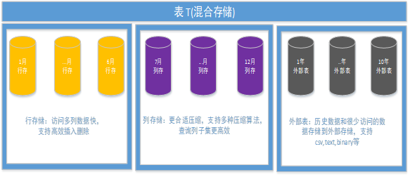 结构化数据的特点是结构固定,每一行的属性是相同的。如传统关系型数据库表中的数据,比如int、float、varchar。KADB支持所有关系型数据类型,存储上不但支持行存而且支持列存,可以行列混合存储以及查询,并且支持数据压缩,提供多个压缩算法,压缩比可高达10比1甚至更高,满足不同场景下的查询性能需求,例如下图分区表T的混合存储:
