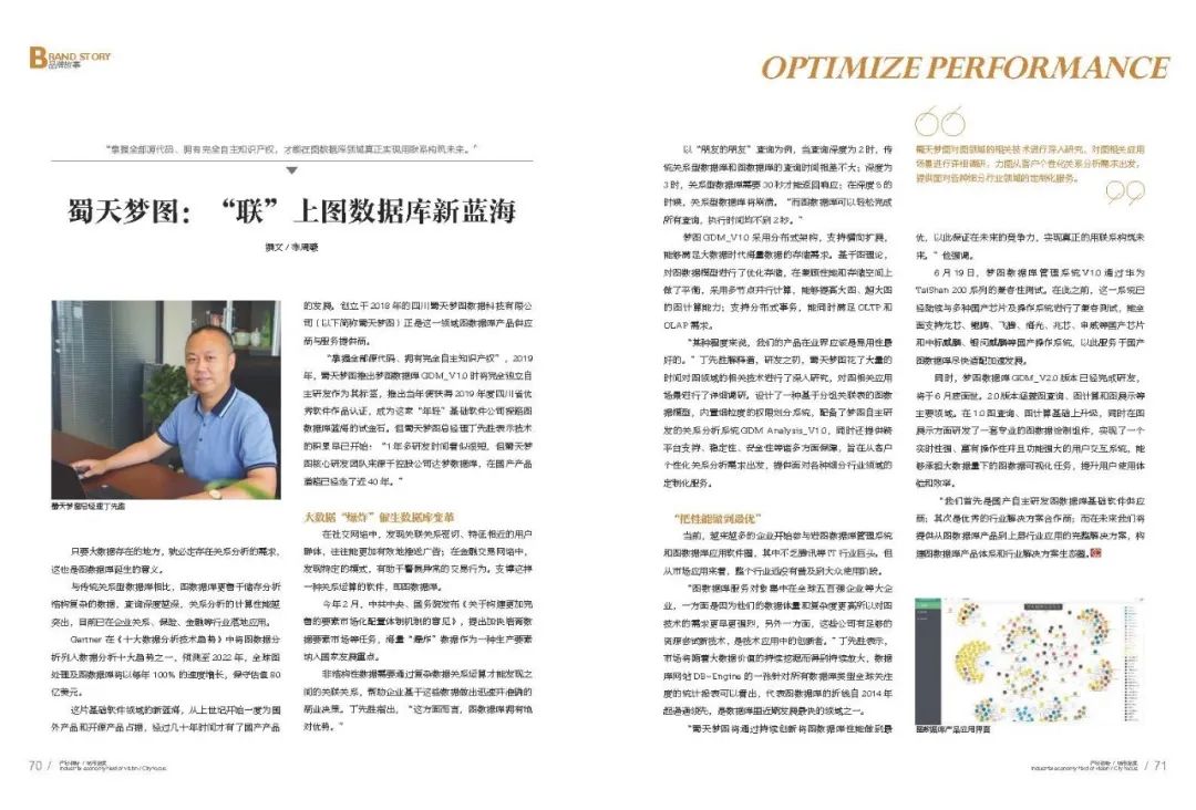 随着数字经济全面爆发,大数据“爆炸”催生数据库变革,新型数据关系运算软件图数据库应运而生。近日,《产城》杂志刊登题为《蜀天梦图:“联”上图数据库新蓝海》的新闻报道,重点介绍了图数据库行业的发展背景、图数据库相比传统关系型数据库的优势,以及蜀天梦图国产自主图数据库产品的功能、特性等。