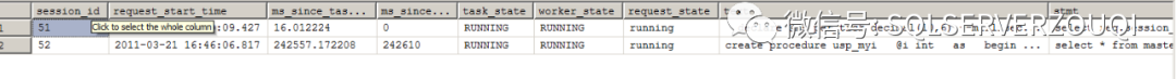 上面的例子可以看到,spid 52 的batch开始的时间是2011-03-21 16:46:06.817, 已经运行了242610毫秒,batch是”create procedure usp_myi…” , 运行的语句是select * from master..sysprocesses,状态是RUNNING.