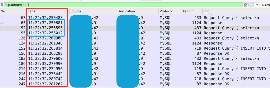 首先怀疑是否是 DB 的瓶颈,于是用 mysqlburst (https://github.com/xiezhenye/mysqlburst) 模拟核心请求,并发 500 下写入(insert) 能达到 4w 左右,应该来说还有比较大的优化空间。不过应用 T 在碰到瓶颈后尝试过扩容 2 台服务器后性能没提升,DB 的确是重点怀疑对象,于是在压测期间抓包: