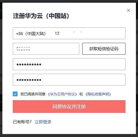 点击免费领取,如果已经有华为云帐号,可以登录进入,如果没有华为账号,可能有点麻烦,需要注册后实名认证,如图: