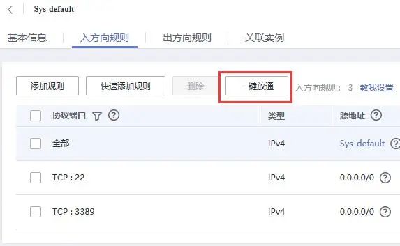 入方向规则下点击一键方通,根据提示点击确定即可,这样就放开了我们使用的端口。