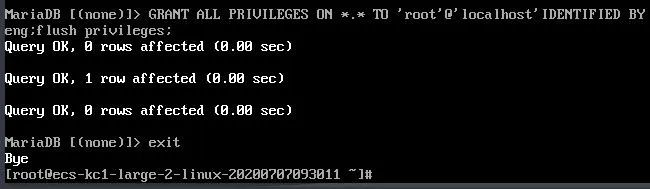 创建成功后输入exit退出GRANT ALL PRIVILEGES ON *.* TO 'root'@'localhost'IDENTIFIED BY '123456' WITH GRANT OPTION;CREATE DATABASE kunpeng;flush privileges;