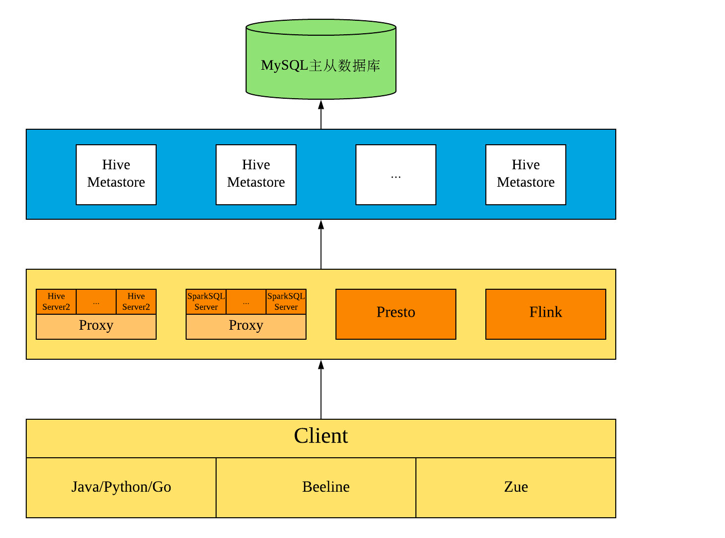 2. 对 Hive Metastore 进行 Federation,采用多套 Hive Metastore + MySQL 的架构,在 Metastore 前方设置代理,按照一定的规则,对请求进行分发。