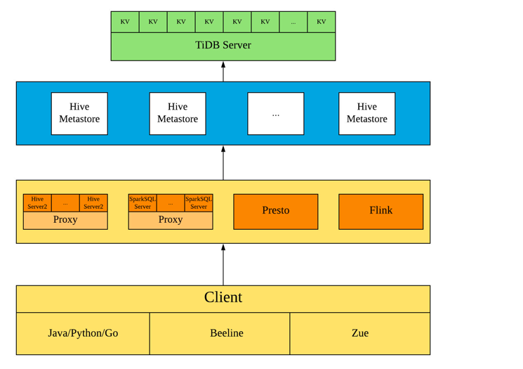 在 Hive 的元数据库迁移到 TiDB 了以后,架构几乎没有任何变化,只不过查询的压力由单台 MySQL 节点分摊到了整个 TiDB 集群,集群越大,查询效率越高,性能提升越明显。