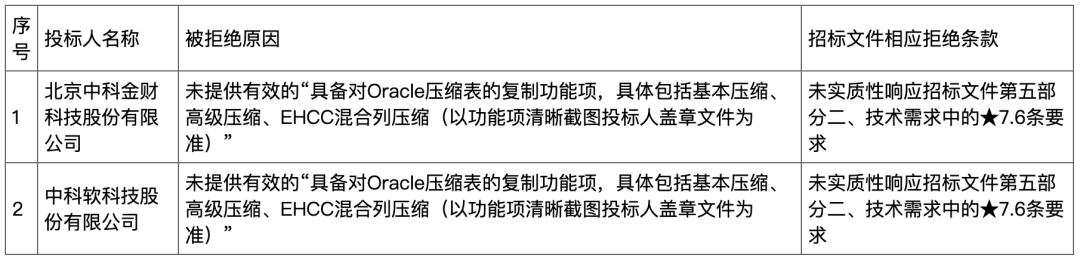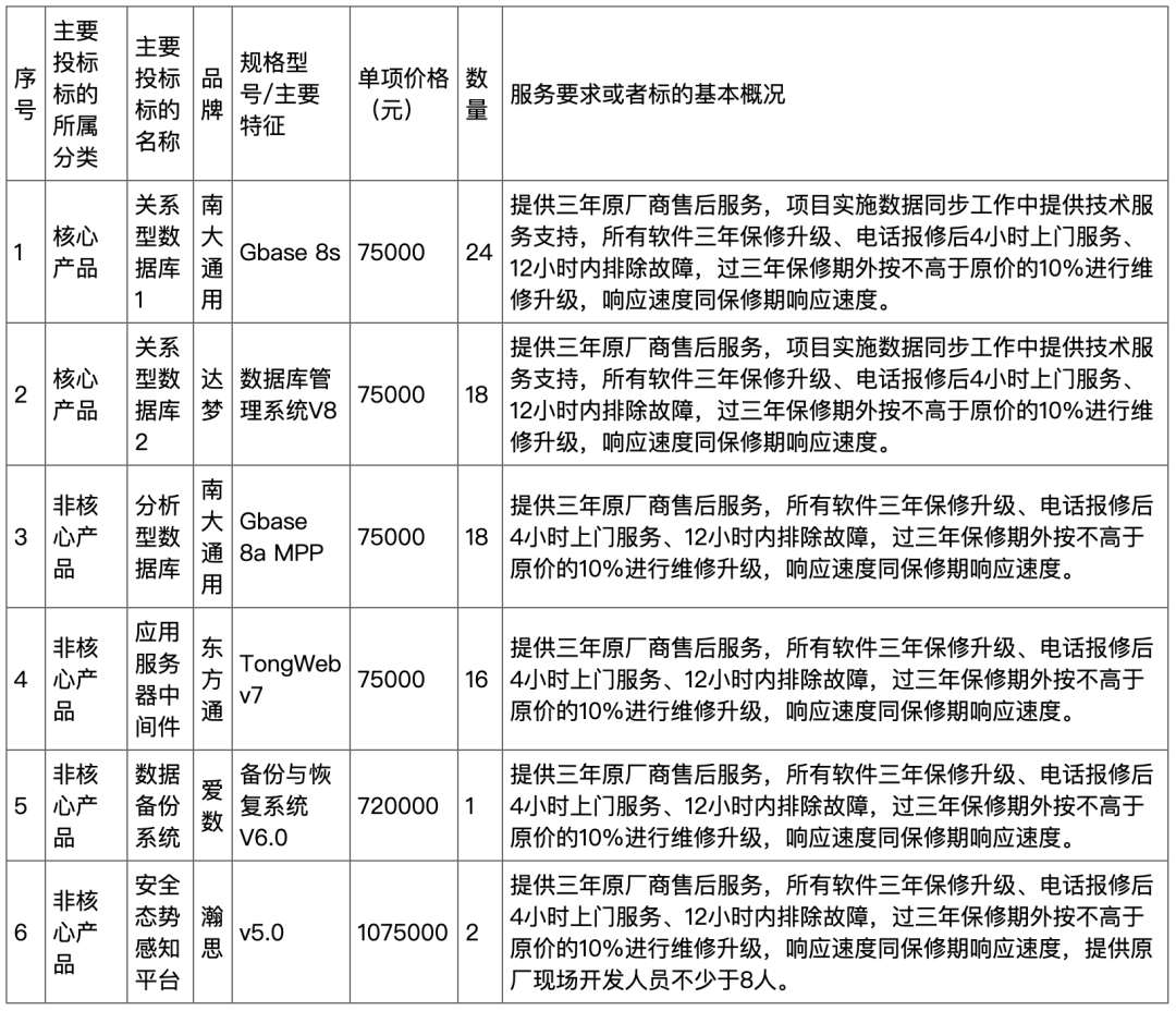 2020年5月28日,国家市场监督管理总局信息中心“十二五”政务信息化工程原质检总局建设项目系统软件采购项目招标公告发布,预算1182.36万元。为保证“十二五”国家政务信息化工程建设规划批复项目(以下简称“项目”)建设高效、有序推进,落实项目建设目标及任务,充分发挥项目的建设效果和投资效益,依据国家发展改革委关于安全生产监管信息化工程、全民健康保障信息化工程和生态环境保护信息化工程质检总局建设项目的项目建议书、可行性研究报告和初步设计方案与投资概算的批复,以及国家政务信息化项目建设的相关规定,制定本实施方案。本次建设涉及3个区域3大业务系统和1个灾备中心,3个区域分别为互联网区、广域网区、内网区,3个业务系统分别为安全生产监管、全民健康保障和生态环境保护;同时为保障应用和数据的可靠性,利用本项目所完善的灾备中心,对生产系统和数据进行验证。主要是支撑和保障“十二五”国家政务信息化工程质检总局建设项目(安全生产监管信息化工程、生态环境保护信息化工程、全民健康保障信息化工程)应用系统(如特种设备安全监管系统、锅炉能效监测管理系统等)正常运行所需的服务器操作系统、数据库、应用服务器中间件、数据同步软件、数据备份系统、安全态势感知平台等软硬件的采购、安装、集成和配置等工作。主要支撑和保障“十二五”国家政务信息化工程质检总局建设项目(安全生产监管信息化工程、全民健康保障信息化工程和生态环境保护信息化工程)应用系统的正常运行。项目内容主要完成以上3个信息化工程的建设中使用的服务器操作系统、数据库、应用服务器中间件、数据同步软件、数据备份系统、安全态势感知平台等软硬件的采购、集成、安装和配置等技术服务,包括本项目中标商还需根据招标采购人要求完成以上软硬件基础平台的建设以及验收等工作。2020年7月19日中标(成交)结果公告发布,中科金财、中科软未通过初审: