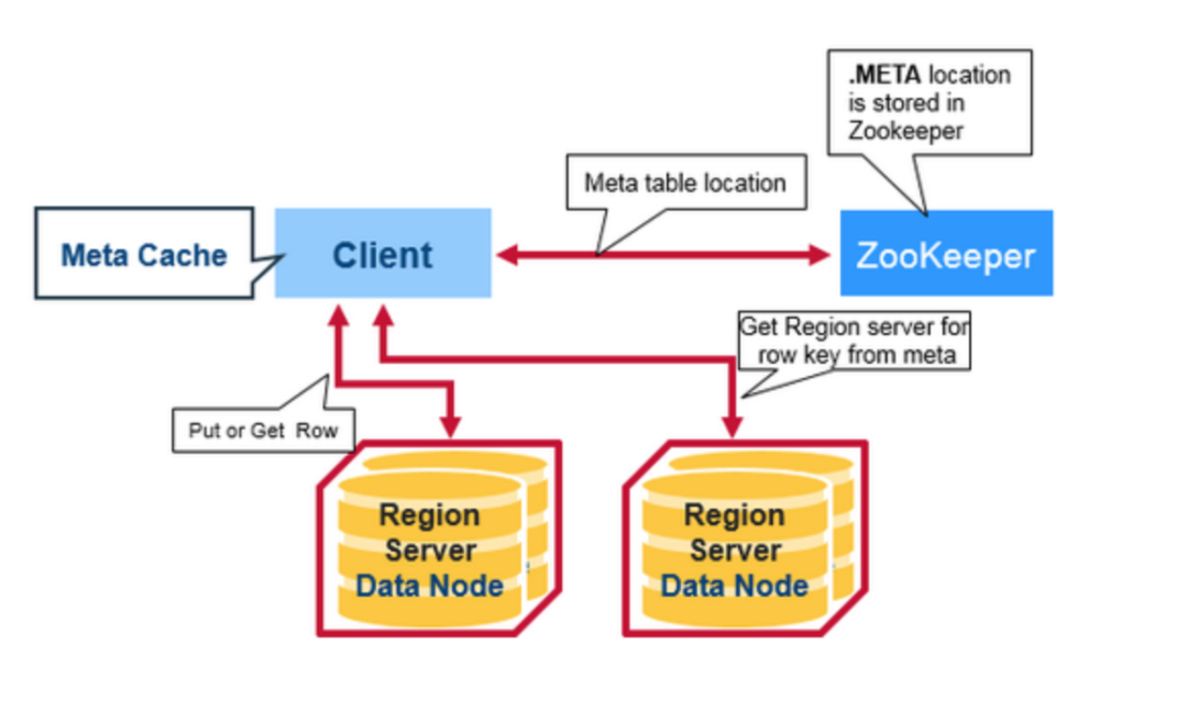下图示出一个完整HBase集群的架构,其中包含ZK节点。当HBase集群启动成功后,会在ZK注册如下znode:/hbase/master,其中包含当前活动(即赢得选举)的HMaster信息;