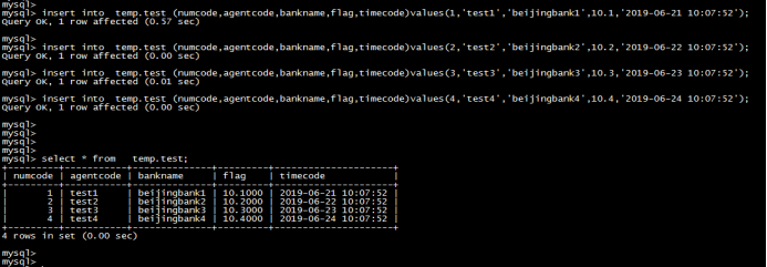 insert into temp.test (numcode,agentcode,bankname,flag,timecode)values(1,'test1','beijingbank1',10.1,'2019-06-21 10:07:52’);insert into temp.test (numcode,agentcode,bankname,flag,timecode)values(2,'test2','beijingbank2',10.2,'2019-06-22 10:07:52’);insert into temp.test (numcode,agentcode,bankname,flag,timecode)values(3,'test3','beijingbank3',10.3,'2019-06-23 10:07:52’);insert into temp.test (numcode,agentcode,bankname,flag,timecode)values(4,'test4','beijingbank4',10.4,'2019-06-24 10:07:52');