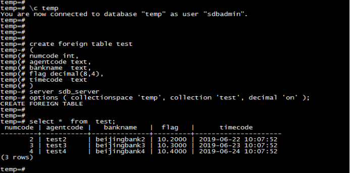 temp=# create foreign table testtemp-# (temp(# numcode int,temp(# agentcode text,temp(# bankname text,temp(# flag decimal(8,4),temp(# timecode texttemp(# )temp-# server sdb_servertemp-# options ( collectionspace 'temp', collection 'test', decimal 'on' );