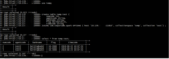 create table temp.test (numcode int,agentcode string,bankname string,flag decimal(8,4),timecode string)USING com.sequoiadb.spark OPTIONS ( host '10.139.***.***:11810', collectionspace 'temp', collection 'test') ;