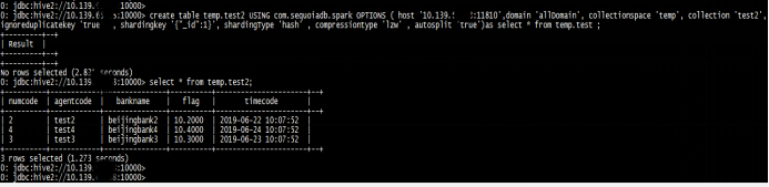create table temp.test2 USING com.sequoiadb.spark OPTIONS (host '10.139.***.***:11810’,domain 'allDomain’,collectionspace 'temp’,collection 'test2’,ignoreduplicatekey 'true' ,shardingkey '{"_id":1}’,shardingType 'hash’ ,compressiontype 'lzw’ ,autosplit 'true’)as select * from temp.test ;