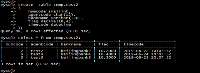 create table temp.test(numcode smallint,agentcode char(12),bankname varchar(120),flag decimal(8,4),timecode datetime);