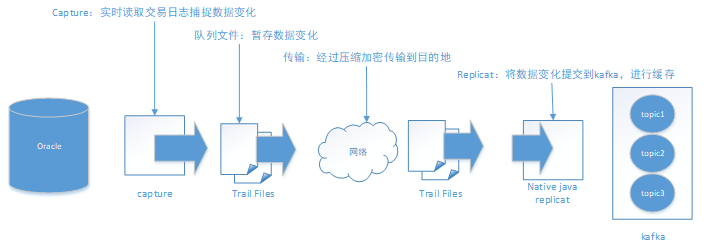 OGG(Oracle GoldenGate):基于日志的挖掘的技术,通过解析源数据库在线日志或归档日志获得数据的增量变化后,再将这些变化的数据传输到 Kafka 中,Kafka 将数据直接进行持久化之前进行消息队列的数据缓存。以下为数据采集架构图: