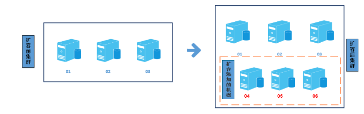当原有的数据库集群无法满足业务需求,此时就需要新增服务器和新增节点来扩容集群。一般用户使用传统的x86服务器即可作为扩容的服务器,按照操作系统要求中的最低配置信息或者推荐配置来配置服务器。在分布式系统中三副本模式是最理想的服务器配置,因此建议扩容按照三台服务器或者三的倍数台服务器来扩容集群,三台服务器中其中保留一个主节点外两台服务器作为副本备份数据。同时三台服务器有利于 Raft 算法选主,不管是经济上还是数据安全可靠性上三副本都是最合适的方案。用户扩容首先需要在一个现有的集群中,添加新的主机,并把新的节点部署到这些新的主机上。