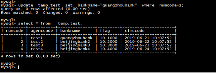 mysql> update temp.test set bankname="guangzhoubank" where numcode=1;Query OK, 0 rows affected (0.00 sec)Rows matched: 0 Changed: 0 Warnings: 0