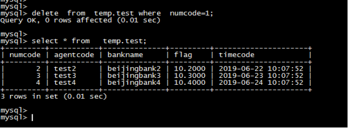 mysql> delete from temp.test where numcode=1;Query OK, 0 rows affected (0.01 sec)mysql> select * from temp.test;