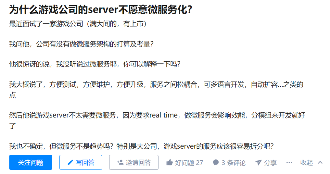 今天在知乎上看到这样一个问题:"为什么游戏公司的 Server 不愿意微服务化?