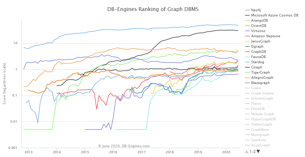 在众多不同的数据模型里,关系数据模型自20世纪80年代就处于统治地位,而且出现了不少巨头,如Oracle、MySQL,它们也被称为:关系数据库管理系统(RDBMS)。然而,随着关系数据库使用范围的不断扩大,也暴露出一些它始终无法解决问题,其中最主要的是数据建模中的一些缺陷和问题,以及在大数据量和多服务器之上进行水平伸缩的限制。同时,互联网发展也产生了一些新的趋势变化:用户、系统和传感器产生的数据量呈指数增长,数据量不断增加,大数据的存储和处理;新时代互联网形势下的问题急迫性,这一问题因互联网+、社交网络,智能推荐等的大规模兴起和繁荣而变得越加紧迫。而在应对这些趋势时,关系数据库产生了更多的不适应性,从而导致大量解决这些问题中某些特定方面的不同技术出现,它们可以与现有RDBMS相互配合或代替它们。过去的几年间,出现了大量新型数据库,它们被统称为NoSQL数据库。其中图数据库从最近十年的表现来看已经成为关注度最高,也是发展趋势最明显的数据库类型。