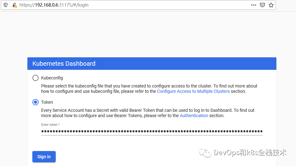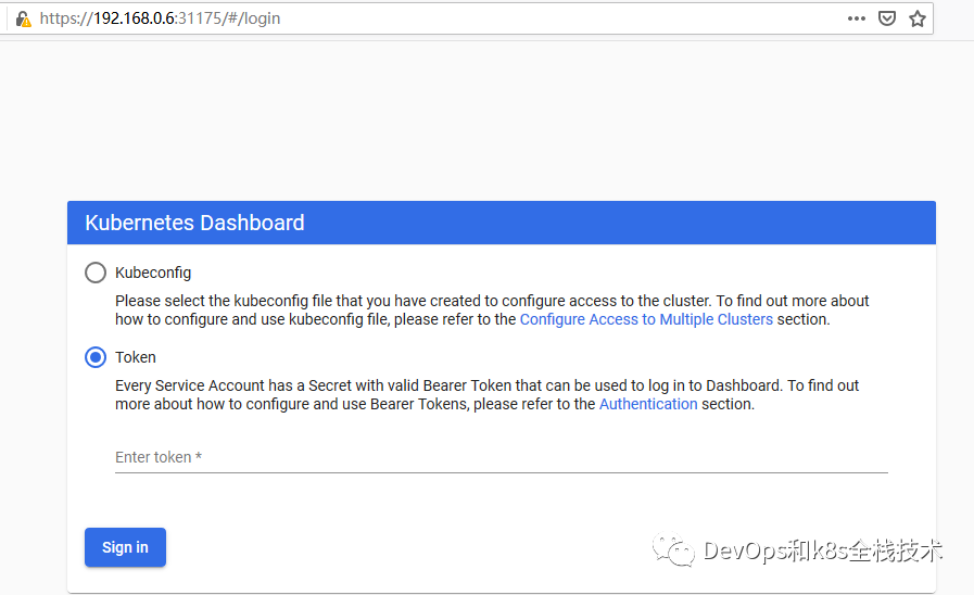 上面可看到service类型是NodePort,访问master1节点ip:31175端口即可访问kubernetes dashboard,我的环境需要输入如下地址