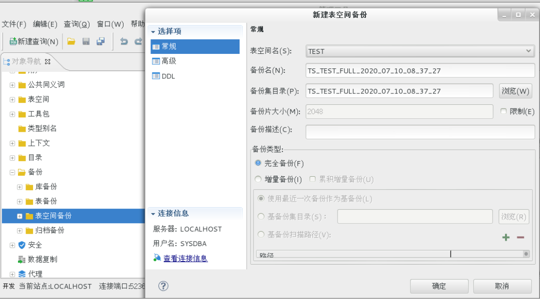 DM8的表空间必须在联机模式下备份。可以使用语句备份和管理工具进行备份: