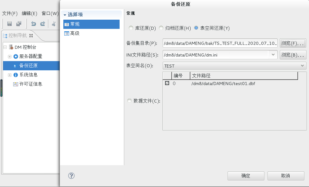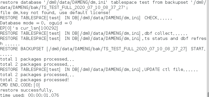 [dmdba@localhost bin]$ ./dmrmandmrman V8RMAN> restore database '/dm8/data/DAMENG/dm.ini' tablespace test from backupset '/dm8/data/DAMENG/bak/TS_TEST_FULL_2020_07_10_08_37_27';