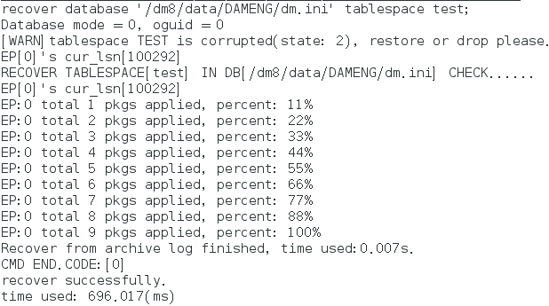 RMAN> recover database '/dm8/data/DAMENG/dm.ini' tablespace test;