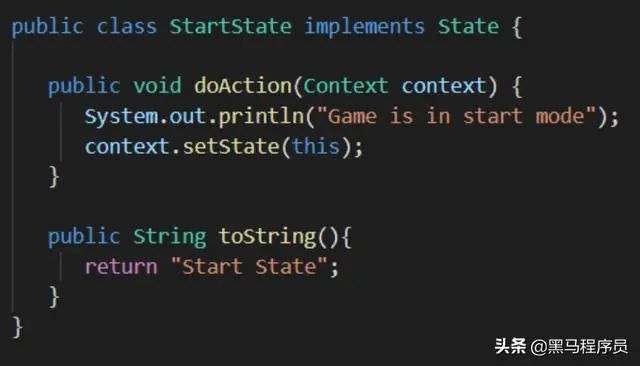 StartState是一个具体的子类,代表游戏的“开始状态”。它覆盖了从接口继承的方法,并且还具有一个返回“开始状态”的字符串的方法。