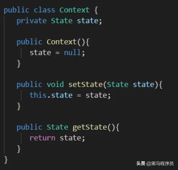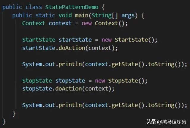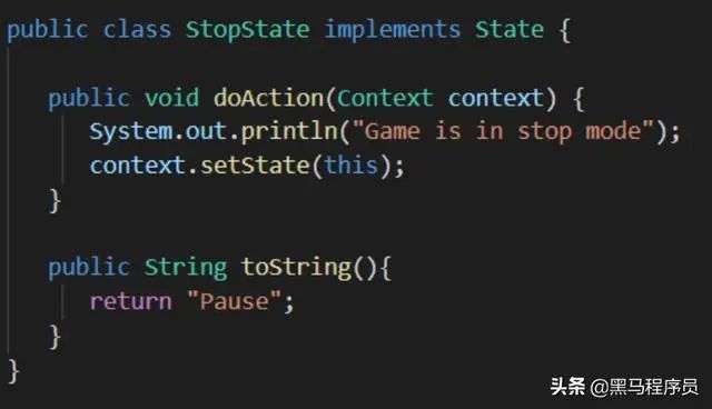 如前所述,上下文在我们的案例中维护了ConcreteState子类,StopState或Start状态的实例。