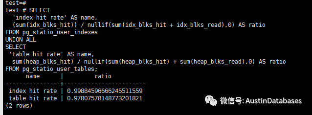 | sum(heap_blks_hit) / nullif(sum(heap_blks_hit) + sum(heap_blks_read),0) AS ratio | |