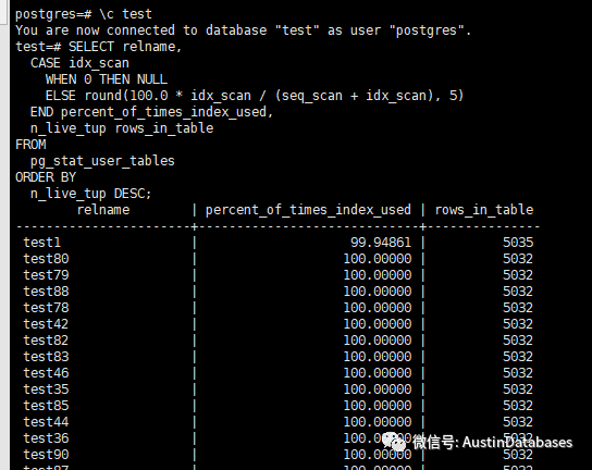 | ELSE round(100.0 * idx_scan / (seq_scan + idx_scan), 5) | |