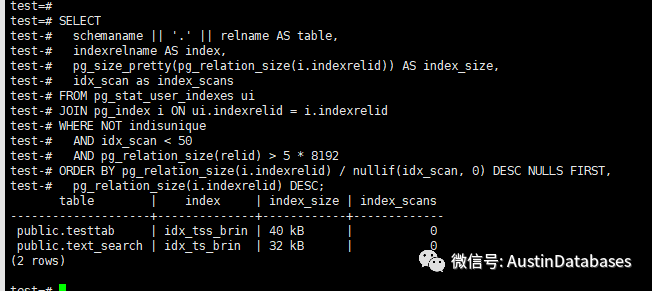 | JOIN pg_index i ON ui.indexrelid = i.indexrelid | |