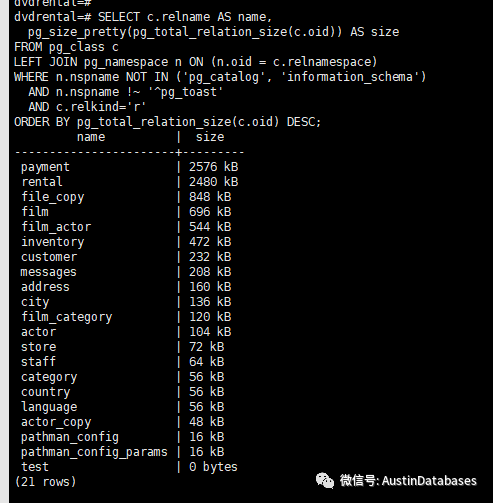 4 一个表的大小,在PG中对于字符的字段是有一个toast 的概念的,要关注toast在每个表中占有多大的空间,可以通过下面的脚本来进行查看