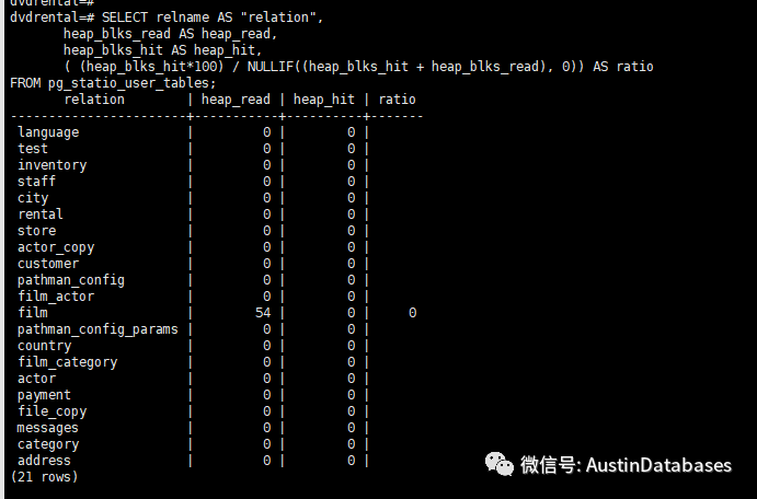 6 在查询中表读取在内存中的命中的数据块是一个需要被关注的参数,下面的脚本中可以看到每个表被读取时,在磁盘中读取和在内存中直接读取之间的数字和比率。