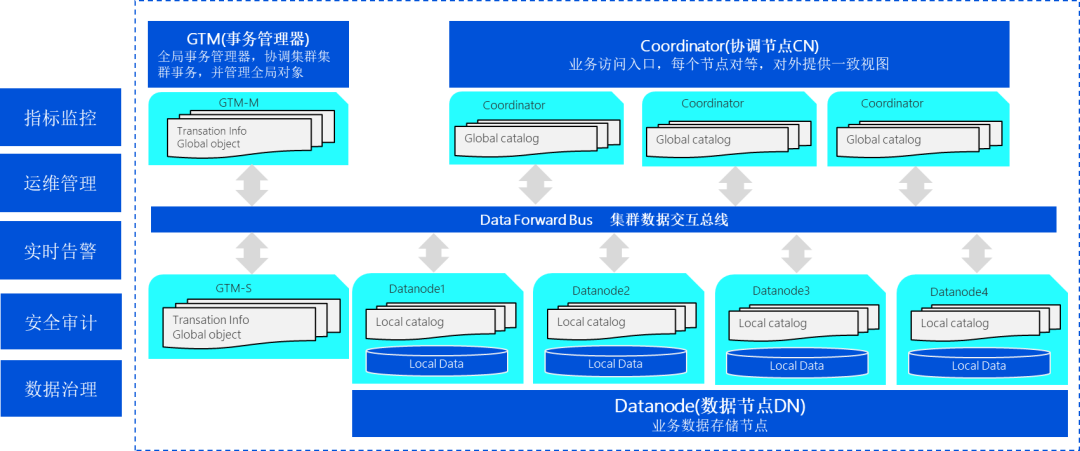 TBase采用了无共享(share nothing)的分布式集群架构,架构图如下所示,再加上它在分布式事务、HTAP、扩展性、安全与容灾等多个方面的能力,使其在多中心多活架构的建设方面具有天然的优势。