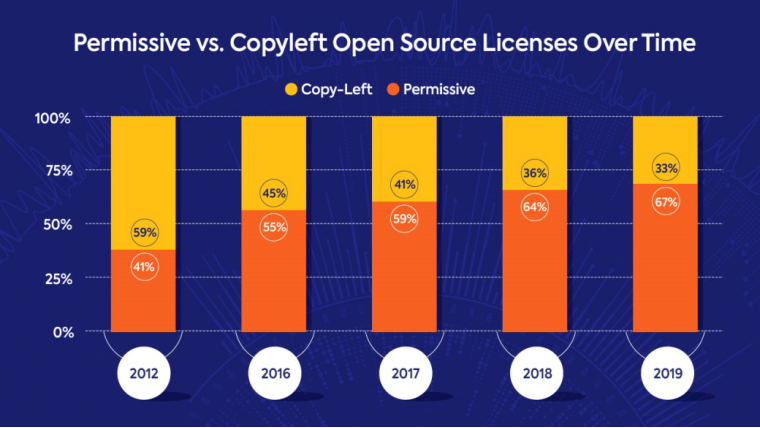 原来的许可证有时被称为“BSD-old”(老BSD)或“4-clause BSD”(四句版BSD)当前的BSD许可证有的被称为“BSD-new”(新BSD)、“revised BSD”(修订的BSD)或“3-clause BSD”(三句版BSD)。NetBSD基金会表示自2008年6月20日开始,采用两句版许可的许可,也就是2-clause BSD-like License,也就是删掉了许可证的第三句和第四句。这样就跟MIT许可证功能上等价了。这也是唯一被允许用作特定库(如KDE)的BSD风格许可证。宽松(permissive)的开放源代码许可证的采用继续增长 (67% );Copyleft许可证(尤其是GPL系列)的使用则继续减少;MIT和Apache 2.0许可证再次在2019十大最受欢迎的开源许可证排行榜上分别排名第一和第二,各自比去年增长了百分之一