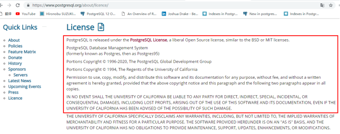 PostgreSQL是在OSI批准的PostgreSQL许可证下发布的。即使在商业软件产品中使用也不收取任何费用。其许可在PostgreSQL国际社区网站有完整描述,如下图: